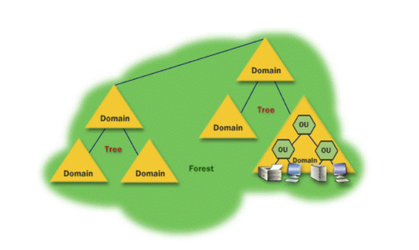 Active Directory est composée d'objets hiérarchisés contenus dans des Unités Organisationnelles (Organizational Unit OU en anglais). De manière générale, l’AD est hiérarchisé et présente une structure arborescente composée de trois degrés :